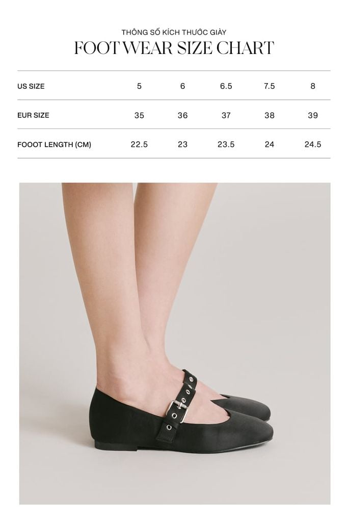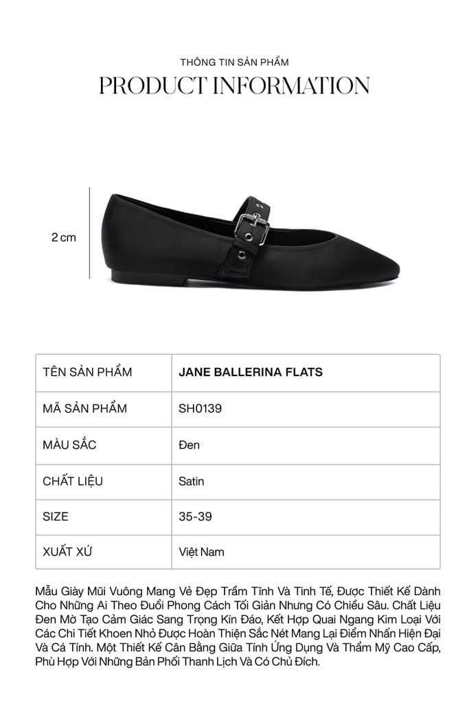 Jane Ballerina Flats – Black mang vẻ đẹp trầm tĩnh và tinh tế, là thiết kế dành riêng cho những ai theo đuổi phong cách tối giản nhưng có chiều sâu. Được hoàn thiện trên nền chất liệu satin cao cấp với độ đen mờ sang trọng, đôi giày tạo cảm giác kín đáo nhưng vẫn cực kỳ thu hút. Điểm nhấn hiện đại nằm ở phần quai ngang kim loại kết hợp cùng các chi tiết khoen nhỏ được chế tác sắc nét, mang lại vẻ ngoài cá tính vừa đủ cho người mang. Với thiết kế mũi vuông hiện đại và cấu trúc chắc chắn, Jane Ballerina không chỉ giúp giữ form dáng đẹp bền bỉ mà còn đảm bảo sự thoải mái tuyệt đối cho đôi chân trong suốt cả ngày dài. Đây là sự lựa chọn cân bằng hoàn hảo giữa tính ứng dụng cao và thẩm mỹ cao cấp, phù hợp với mọi bản phối thanh lịch và có chủ đích.