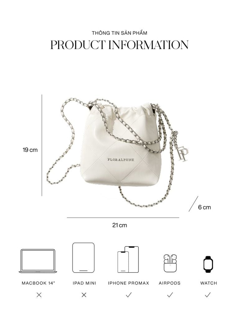 - Sức chứa: iPad mini, iPhone/Max, ví, son, AirPods, đồ trang điểm nhỏ gọn