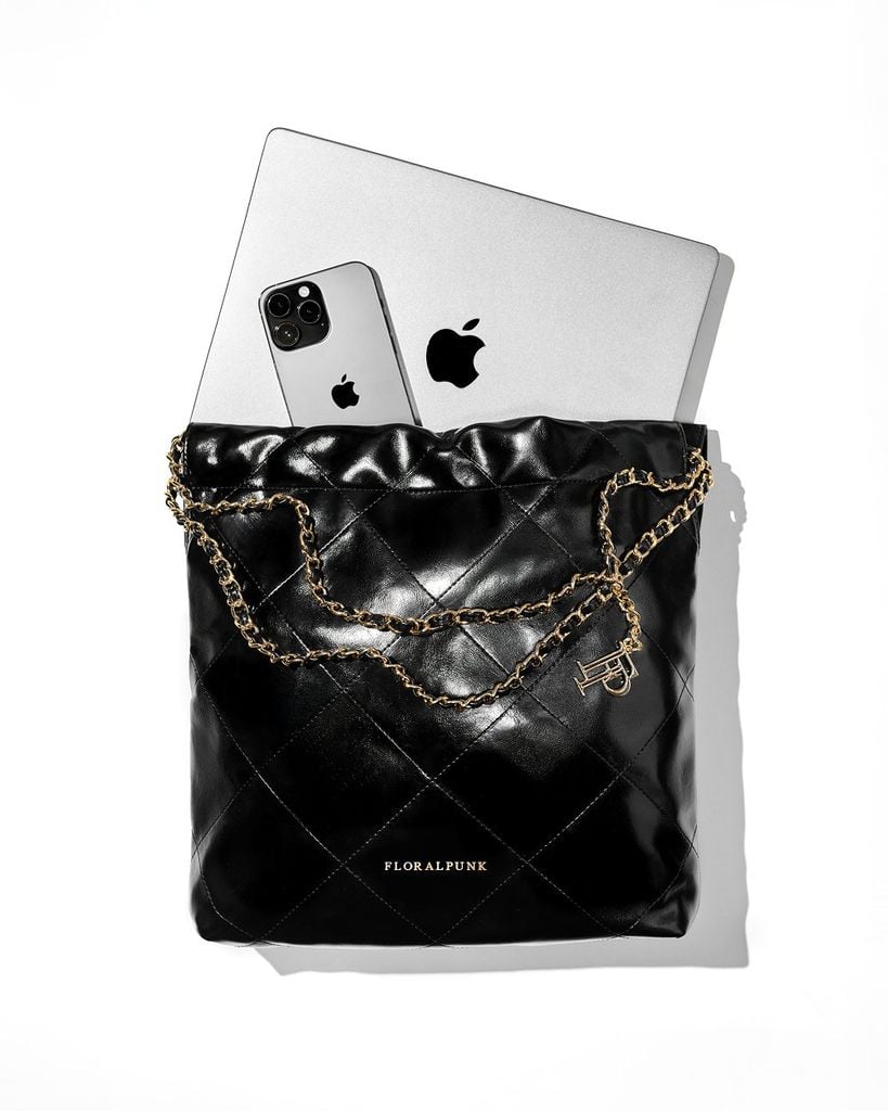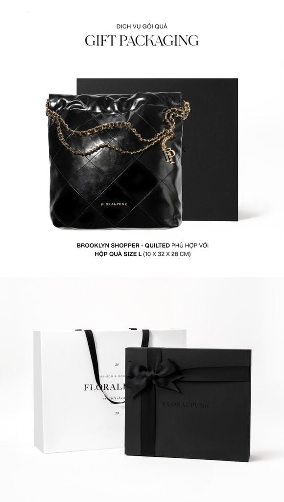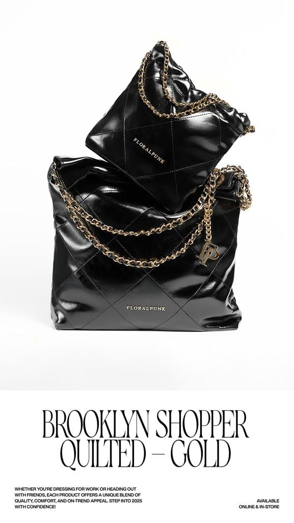 Brooklyn Shopper Quilted là chiếc túi tote thời trang cỡ lớn từ Floralpunk, được thiết kế với họa tiết ô trám sang trọng và điểm nhấn dây xích kim loại mạ vàng. Sự kết hợp giữa màu đen basic và hardware ánh vàng giúp túi mang vẻ ngoài cá tính, hiện đại nhưng vẫn giữ được nét thanh lịch. Với kích thước lớn, túi phù hợp để mang laptop 14 inch cùng các vật dụng cá nhân, lý tưởng cho những ngày đi làm, đi học hoặc dạo phố.