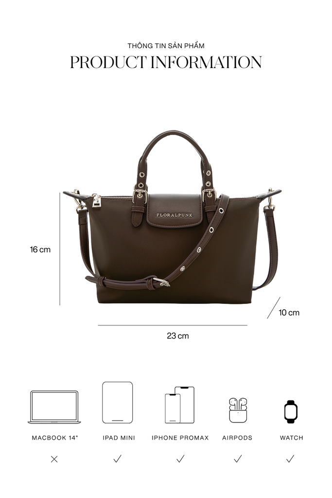 + Kèm 2 loại quai: quai ngắn cầm tay và quai dài đeo chéo có thể tháo rời và điều chỉnh độ dài.