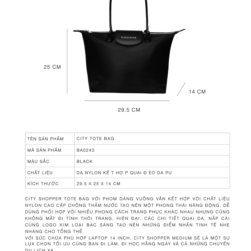 City Tote Bag từ Floralpunk là mẫu túi dáng vuông hiện đại, thiết kế tối ưu cho nhu cầu di chuyển hằng ngày. Chất liệu nylon cao cấp chống thấm nước kết hợp quai đeo da và nắp cài logo kim loại bạc – tạo nên tổng thể tinh tế, năng động nhưng vẫn giữ được nét thanh lịch. Túi phù hợp cho mọi phong cách thời trang từ công sở đến dạo phố, giúp bạn mang theo laptop 14 inch và các vật dụng cần thiết khi đi làm, đi học hoặc du lịch.