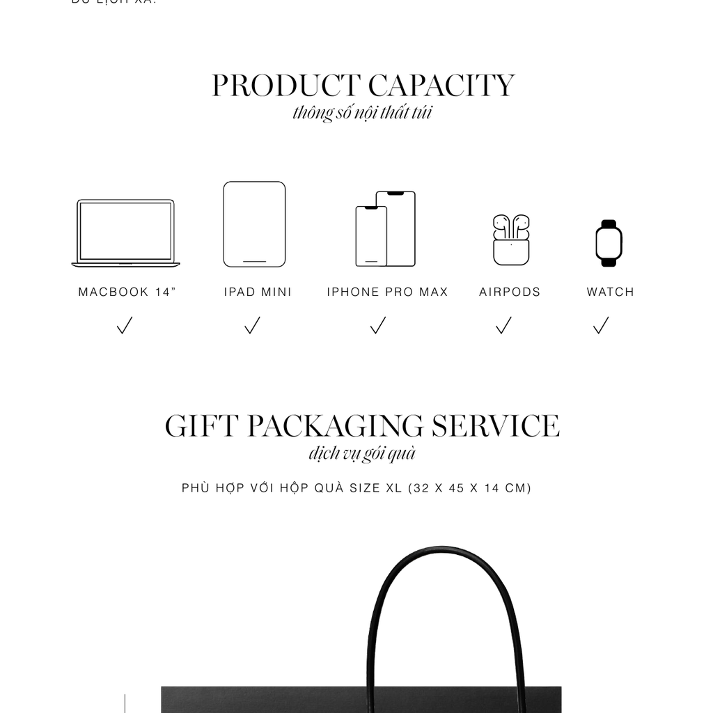 - Sức chứa: Laptop 14 inch, sổ tay, ví, điện thoại, mỹ phẩm cá nhân.