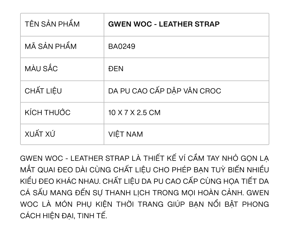 Gwen Woc là thiết kế ví đeo chéo nhỏ gọn đến từ Floralpunk, được làm từ chất liệu da PU cao cấp với họa tiết giả da cá sấu sang trọng. Phiên bản dây da (leather strap) mới mang đến cảm giác thanh lịch, tối giản và hiện đại hơn so với phiên bản dây xích trước đó. Thiết kế tinh tế giúp bạn dễ dàng phối cùng nhiều outfit từ đi chơi đến đi tiệc, là món phụ kiện lý tưởng cho những ai yêu thích phong cách hiện đại và thời trang.