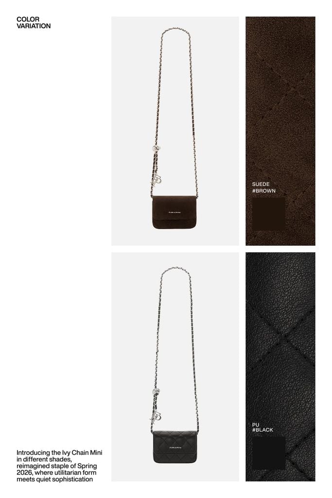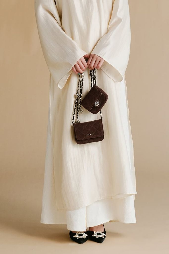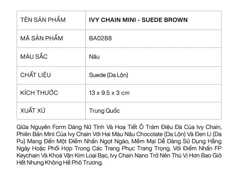 Ivy Chain Mini – Suede Brown là sự kết hợp tinh tế giữa phom dáng túi mini hiện đại và chất liệu da lộn cổ điển, mang đến vẻ đẹp vừa ấm áp vừa sang trọng. Chiếc túi gây ấn tượng với họa tiết chần bông ô quả trám tỉ mỉ trên nền gam màu nâu trầm tôn da, tạo điểm nhấn thanh lịch cho mọi bộ trang phục. Với thiết kế tối giản nhưng cực kỳ thời thượng, Ivy Chain Mini là phụ kiện không thể thiếu cho những cô nàng yêu thích sự gọn nhẹ khi đi làm, dạo phố hay tham gia những buổi tiệc nhẹ nhàng.