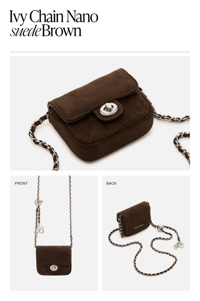 Ivy Chain Nano – Suede Brown là phiên bản túi mini đầy lôi cuốn, kết hợp giữa phom dáng túi chần trám cổ điển và chất liệu da lộn tông nâu ấm áp. Với kích thước nhỏ xinh như một món trang sức, chiếc túi mang lại cảm giác chỉn chu, đáng yêu nhưng vẫn vô cùng sang trọng khi hiện diện trong những set đồ hằng ngày. Thiết kế phom đứng cứng cáp giúp túi giữ dáng cực tốt, biến Ivy Chain Nano trở thành món phụ kiện đa năng: bạn có thể đeo độc lập như một điểm nhấn thời thượng hoặc dùng làm charm trang trí kèm những chiếc túi lớn hơn. Đây chính là lựa chọn lý tưởng cho những ai yêu thích phong cách tối giản nhưng muốn lưu giữ nét tinh tế, khác biệt.