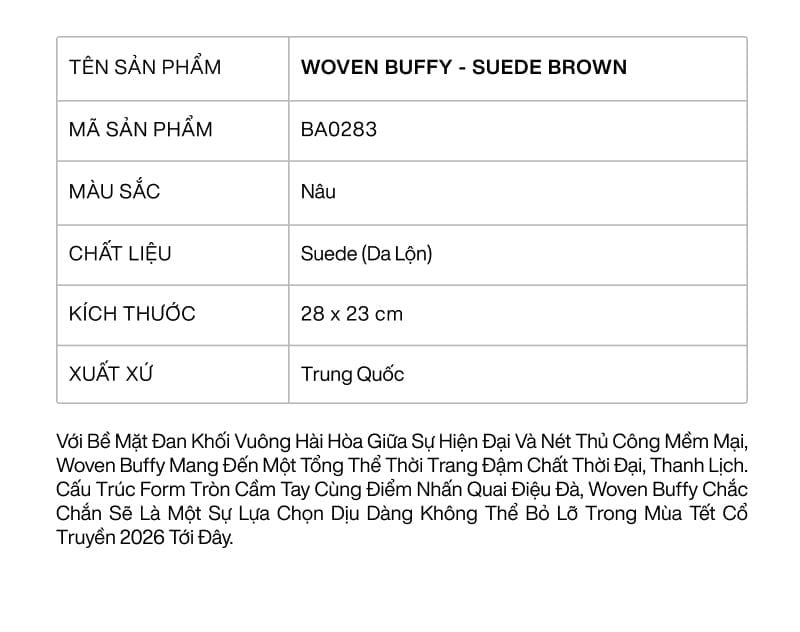 Woven Buffy – Suede Brown mang dáng hobo mềm mại với bề mặt đan nổi tinh tế, tạo cảm giác vừa ấm áp vừa thời trang. Chất liệu da lộn mang sắc nâu trầm giúp tổng thể trở nên sang trọng nhưng vẫn rất dễ phối đồ hằng ngày. Phần quai liền thân được thiết kế chắc tay, mang lại sự thoải mái khi cầm hoặc đeo vai. Với thiết kế tối giản nhưng có điểm nhấn ở bề mặt đan, chiếc túi là lựa chọn hoàn hảo cho những ai yêu thích phong cách thanh lịch, tự nhiên và có chiều sâu. Đây là phụ kiện lý tưởng để đồng hành cùng bạn khi đi làm, dạo phố hay những buổi cà phê cuối tuần.