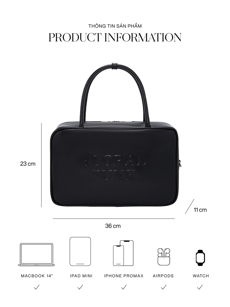 - Sức chứa: Laptop 13 inch, tài liệu A4, điện thoại, ví, sổ tay, mỹ phẩm và các vật dụng cá nhân khác.